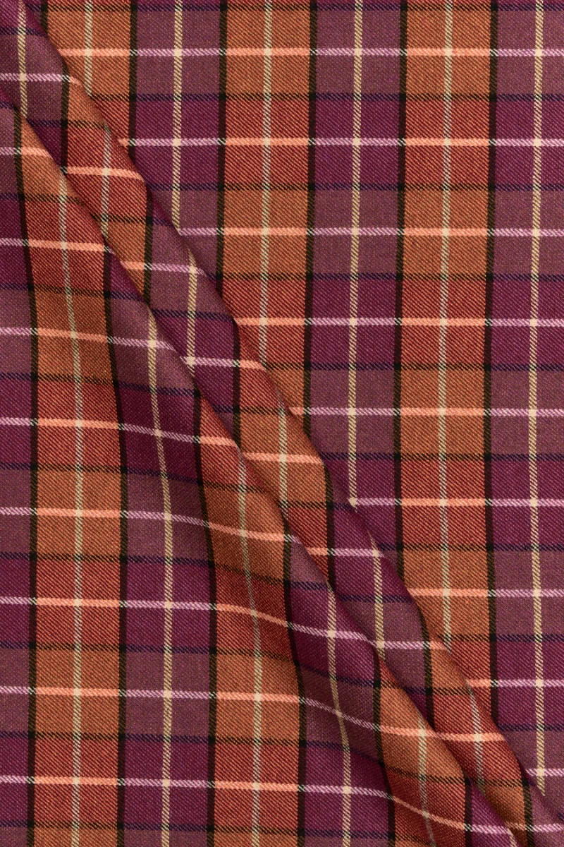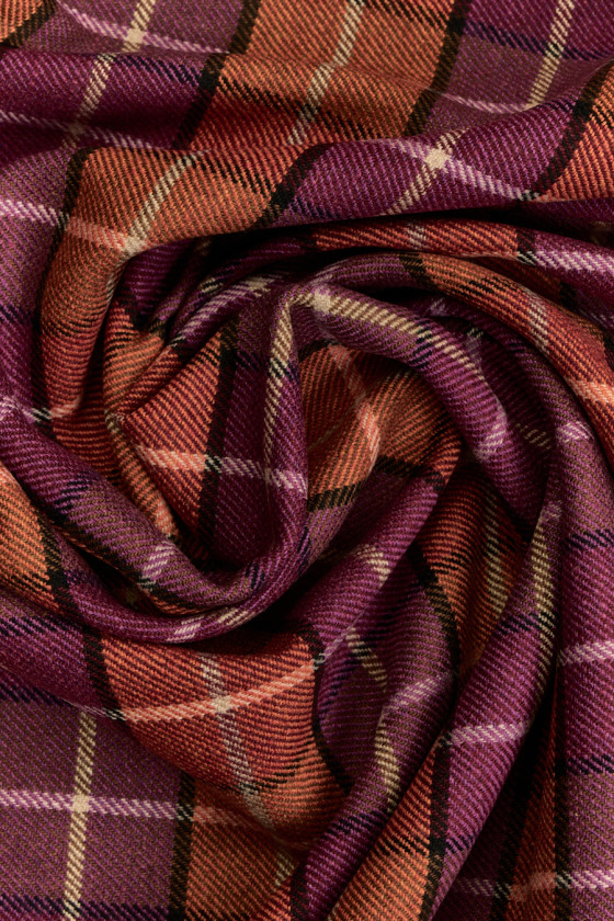 Італійська костюмна тканина з осінньо-зимової колекції, виткана з вовни та поліестеру з помаранчевим та фіолетовим мотивом у клітинку. Правильна форма, що складається з квадратів, розміщених поруч один з одним, розміром 2 см * 2 см. Тканина середньої товщини, м'яка, приємна на дотик і гнучка. Вона виконана в ніжному саржевому переплетенні. Позачасова пропозиція, яка ідеально підійде для пошиття спідниці, сукні, а також штанів і піджака.