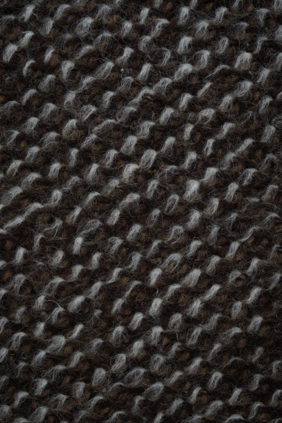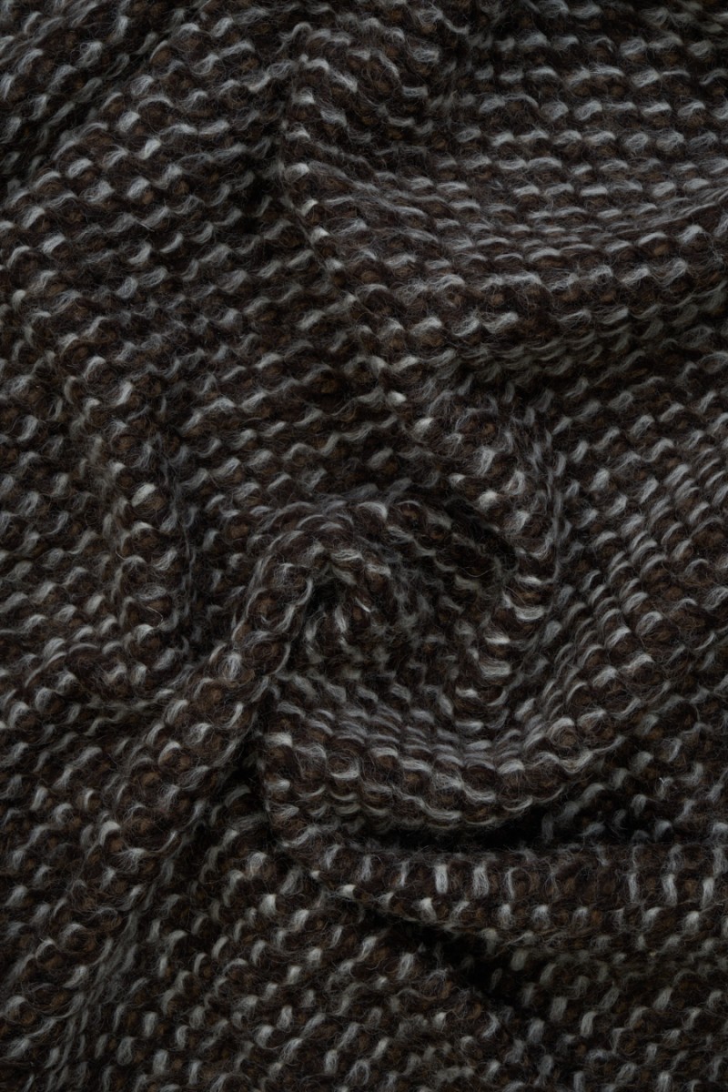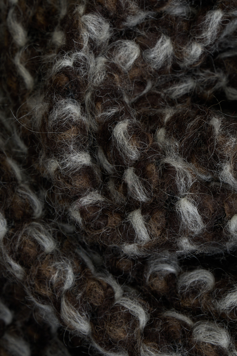 Італійська вовняна тканина з опуклим буклеподібним переплетенням светра, виткана з 80% натуральної вовни та 20% поліестеру. В цілому витриманий в осінніх кольорах бежевого, коричневого і білого. Тканина виготовляється переважно з натуральних волокон, тому вона дуже зручна в носінні, а додавання синтетичної нитки робить її більш міцною і менше мнеться, ліва сторона тканини виконана в гладкому переплетенні. Фантастична пропозиція для людей, які люблять теплі тканини, ідеально підходить для верхнього одягу, такого як тонке пальто та светр-блейзер, кардиган.