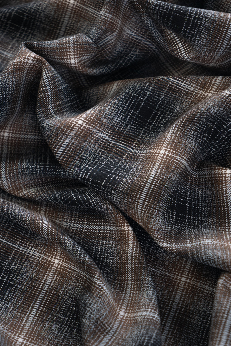 Італійська костюмна тканина з картатим мотивом (6 см) чорного, сірого та коричневого кольорів. М'яка тканина з щільним переплетенням, що нагадує шерсть.