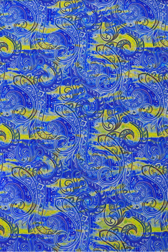 Італійське еластичне трикотажне полотно з лайкри волошкового кольору з пронизливим жовтим кольором і східним мотивом Пейслі. Тканина з компактним, гладким плетінням, дуже еластична - ідеально підходить для людей, яким подобається одяг, що облягає тіло, і східні візерунки. Він ідеально підходить для пошиття повсякденного одягу, а також купальників, оскільки зручний і швидко сохне.