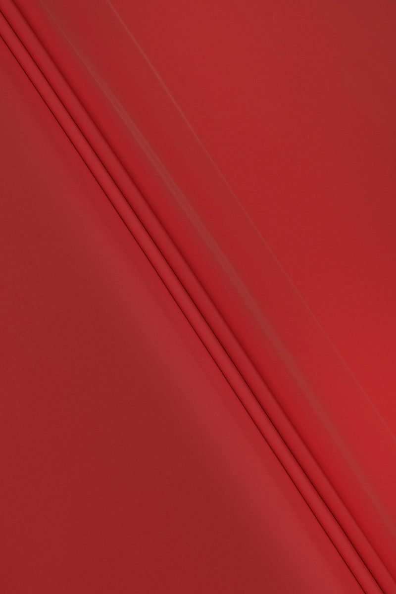 Італійська лайкра з червоним кольором. Трикотажне полотно з правого боку гладке і матове, в той час як на лівій стороні були подряпані, завдяки чому на нижній поверхні утворився м'який і дуже приємний на дотик пух. Матеріал теплий і еластичний, ідеально підходить для осінніх і зимових днів.