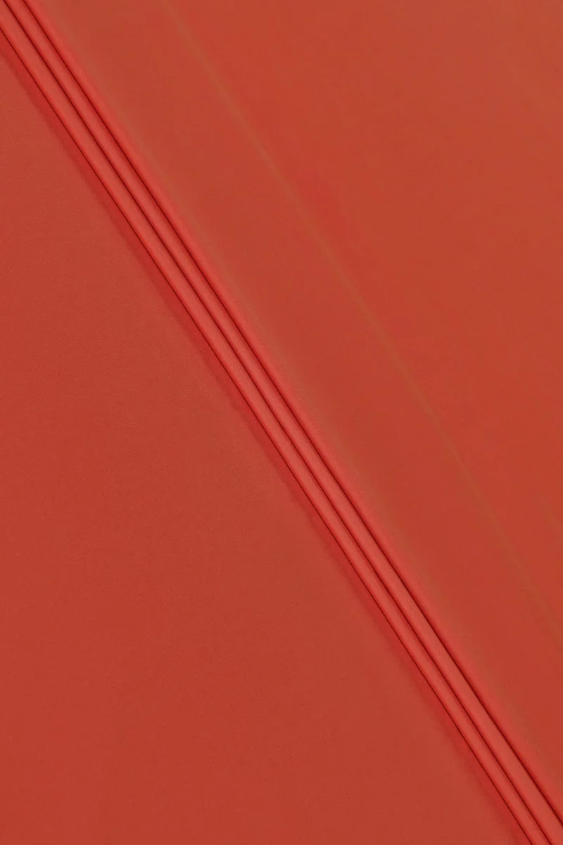 Італійська лайкра пофарбована в червоний колір з ніжним металевим блиском. Трикотажне полотно з правого боку гладке і матове, в той час як ліва сторона була подряпана, завдяки чому на нижній поверхні був створений м'який і дуже приємний на дотик пух. Матеріал теплий і гнучкий, ідеально підходить для осінніх і зимових днів.