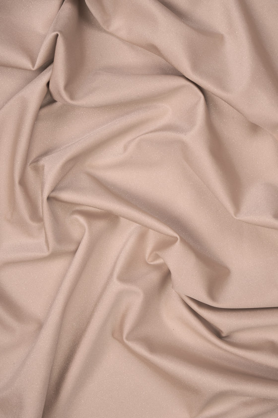 Італійське еластичне трикотажне полотно з лайкри нюдового бежевого кольору з сріблястим блиском (не спадає). Тканина з щільним, щільним плетінням, дуже еластична - ідеальний варіант для людей, яким подобається облягаючий одяг. Він ідеально підходить для пошиття танцювального або вечірнього одягу, а також купальників, оскільки він зручний і красиво блищить.