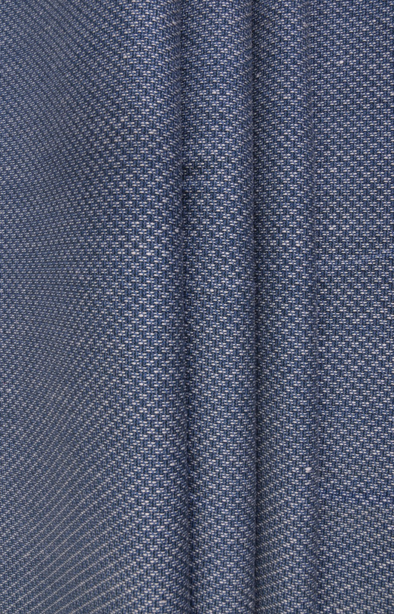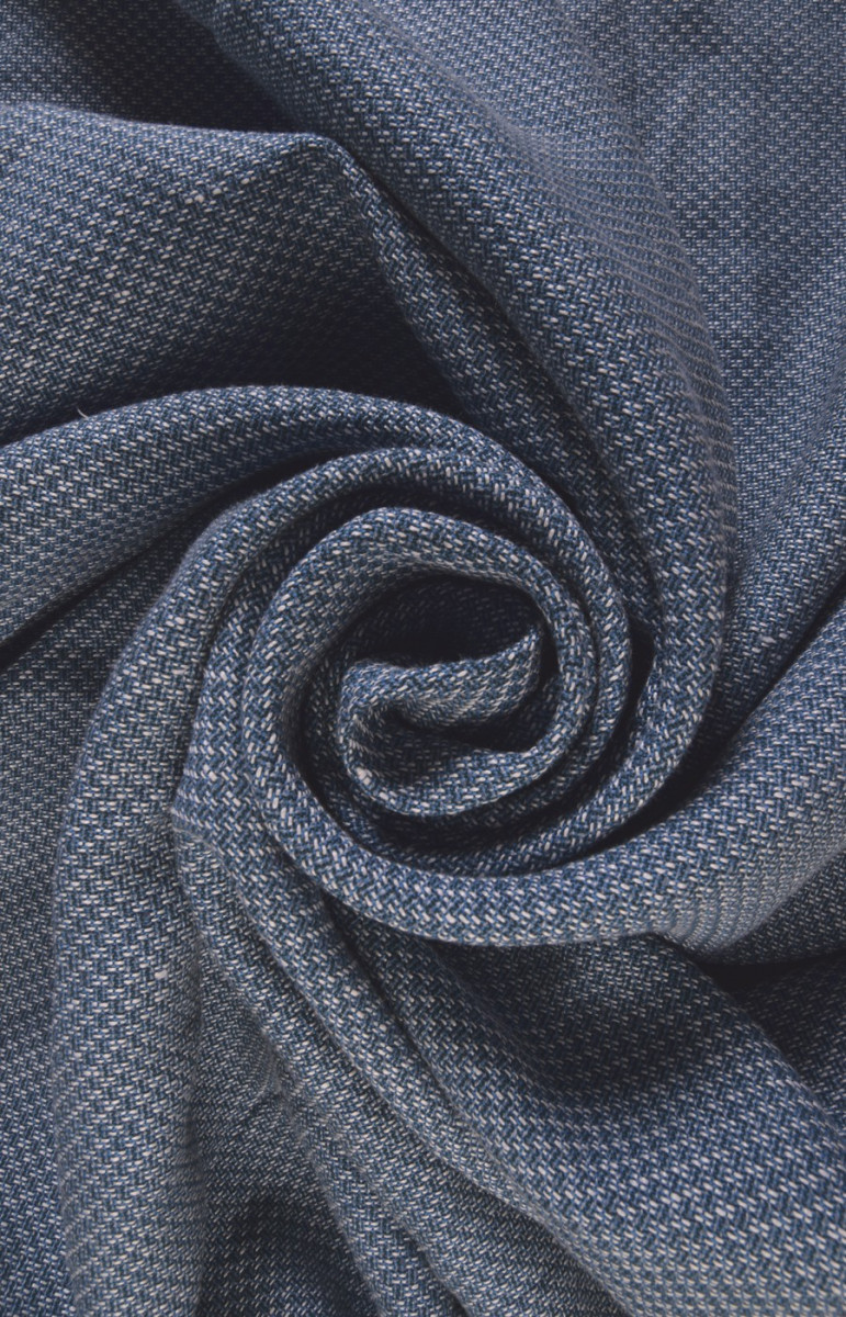 Льон - екологічна тканина, вона виготовляється з рослинних волокон. Це призводить до його повного розкладання, через що лляні тканини безпечні для навколишнього середовища. На фото представлений льон, сплетений по черзі білими і синіми нитками, що дає ефект невеликої сітки.
