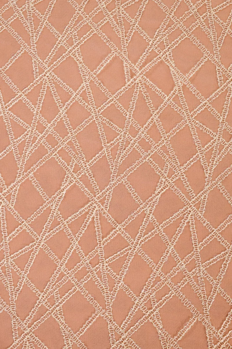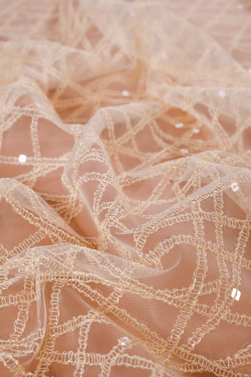 Італійське мереживо світло-бежевого кольору з цікавим геометричним мотивом, прикрашене прозорими паєтками. Коронка оброблена з двох сторін зубцем. Відмінно підійде для пошиття блузки, сукні, спідниці.
