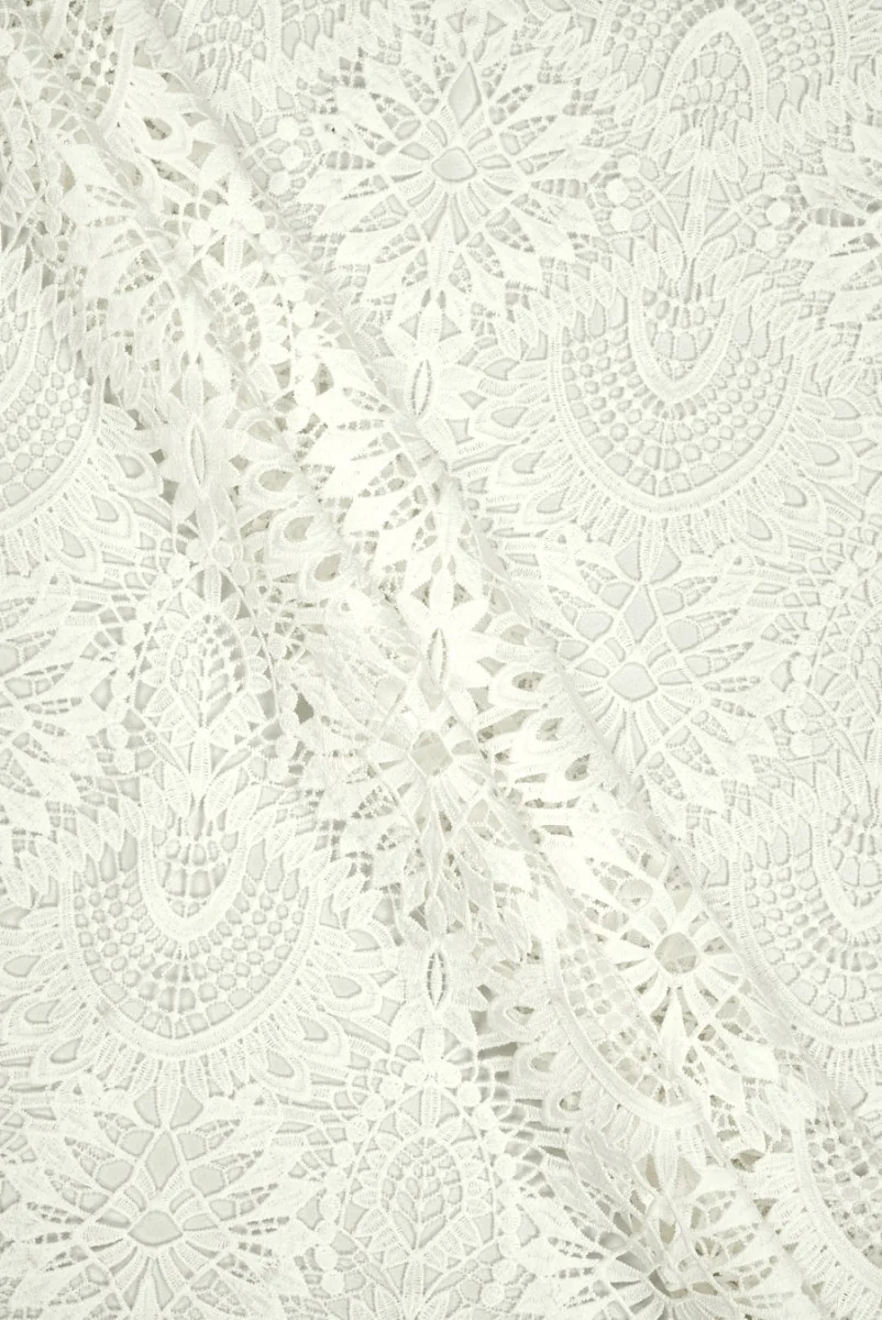 Італійський гіпюр кремового кольору з красивим мотивом, схожим на макраме. Малюнок щільний і правильний. Тканина середньої товщини, нееластична, прозора і оброблена з двох сторін зубчиком - рекомендуємо шити по колу. Унікальна пропозиція, яка ідеально підійде для проектів у стилі бохо, таких як сукні, блузи, спідниці, а також жакети чи шорти.