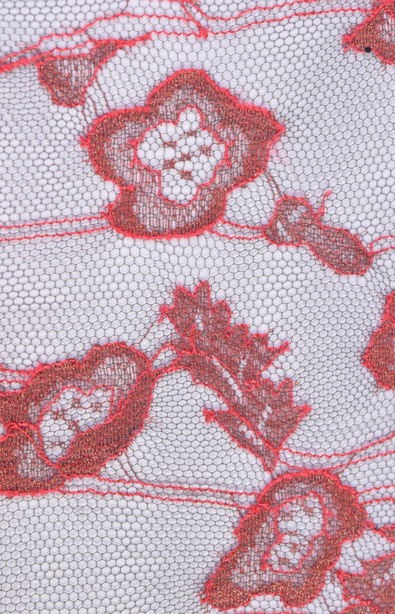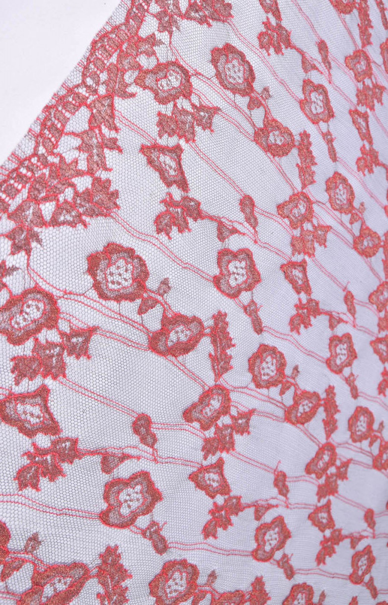 Тонке, ніжне мереживо світло-бордового і рожевого кольору на чорному тюлі. Закінчується зубом з двох сторін. Делікатна тканина. Ідеально підходить для блуз, суконь.