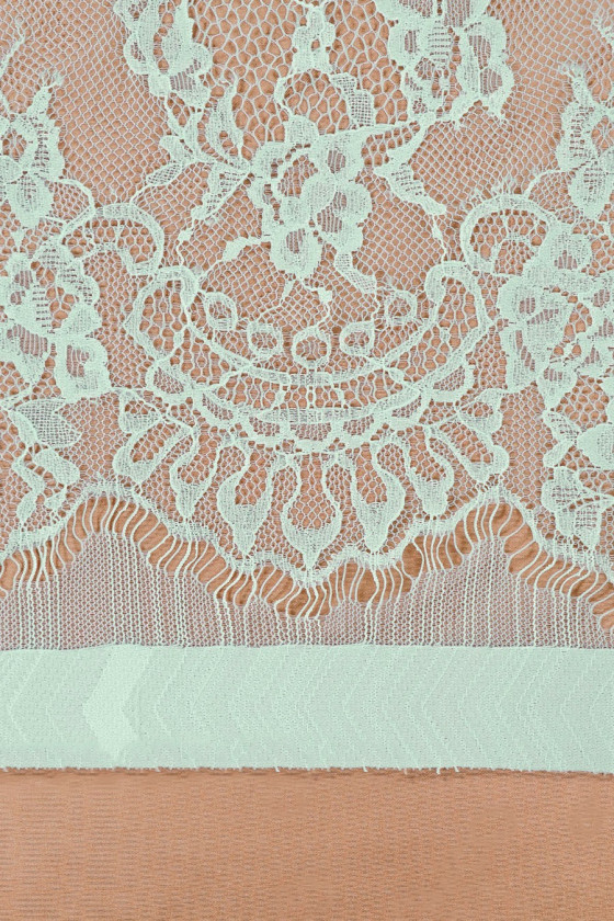 Красива корона в пастельному м'ятному кольорі - оброблена з двох сторін зубчиком (для самостійного зрізання). Ніжна тканина, ідеально підходить для вечірніх суконь або блуз.