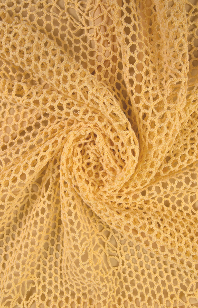 Мереживо світло-жовтого кольору з сітчастим переплетенням з квітковим візерунком. Ми рекомендуємо його для пошиття ретро-суконь, блуз або шарфів і шалей. Купон з розмірами 110см*125см.