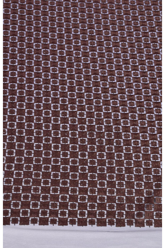 Мереживо з геометричним малюнком. Тканина поєднується з тюлем. Ширина тканини 140 сантиметрів, з яких 90 см – мереживо, 50 см – тюль (чорний)