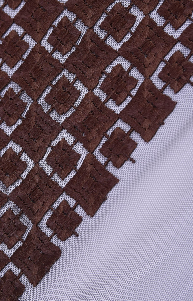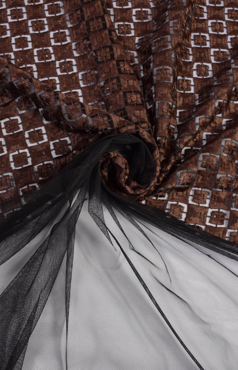 Мереживо з геометричним візерунком. Тканина поєднується з фатином. Ширина тканини 140 сантиметрів, з яких 90 см - мереживо, 50 см - фатин (чорний)