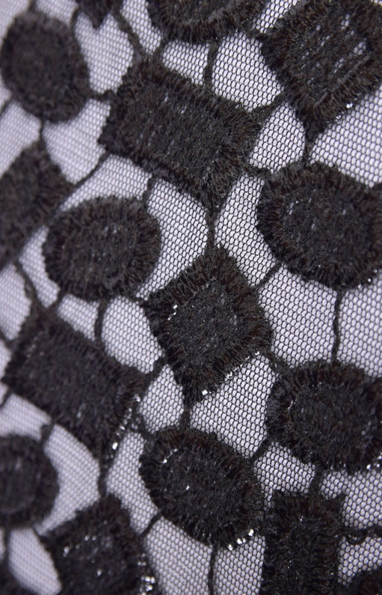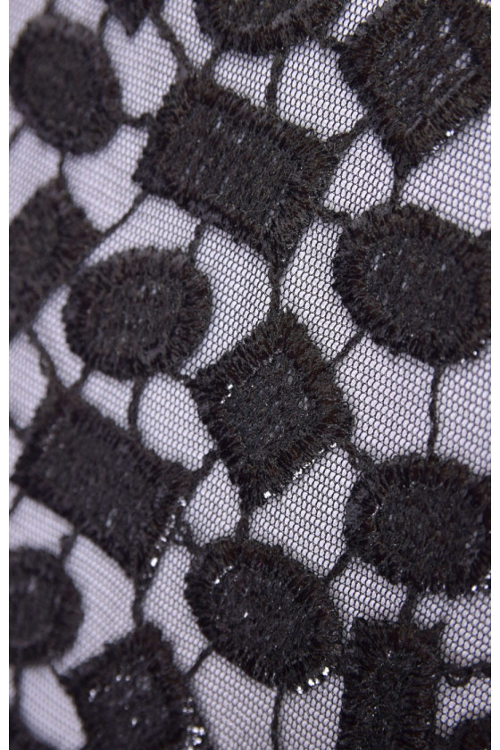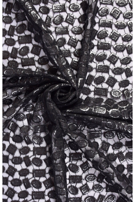 Мереживо з геометричним малюнком . Нитки покриті тонким шаром лаку, що надає їй блиск. Злегка еластична тканина. Ідеально підходить для суконь і блуз.