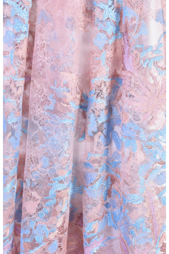 Красиве мереживо пудрово-рожевого і блакитного кольору з вишивкою, що створює 3D ефект. Тканина шириною 140 см. Він м'який і ніжний. Ідеально підходить для суконь або блуз.