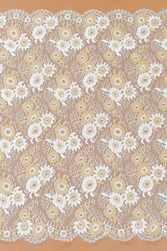 Мереживо шириною 80 см з вишитими квітами екрю і бежевим кольором. Ми рекомендуємо його для пошиття корсетів, блуз або для вставок. Ідеально поєднується з шовковим атласом.