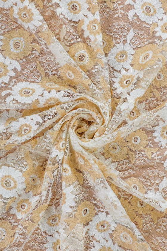 Мереживо шириною 80 см з вишитими квітами екрю та бежевим. Ми рекомендуємо його для пошиття корсетів, кофтинок або для вставок.