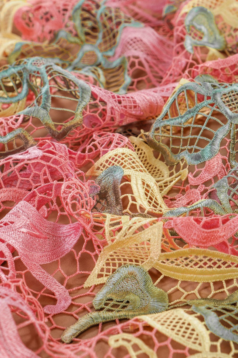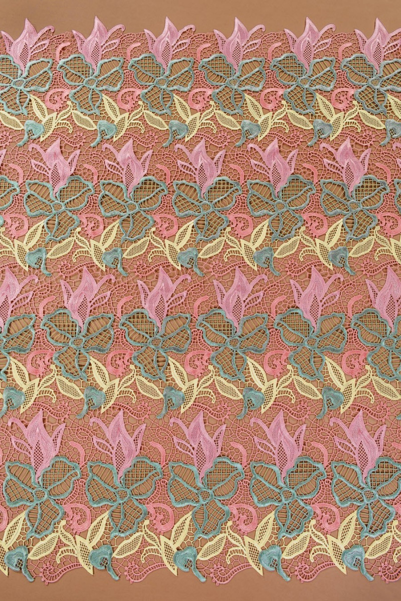 Італійське гіпюрове мереживо пастельних тонів, середньої товщини. Ми рекомендуємо його для суконь або спідниць.