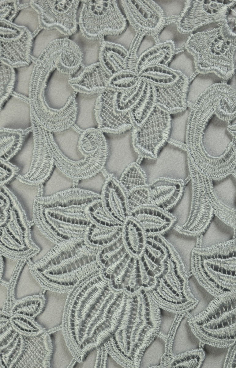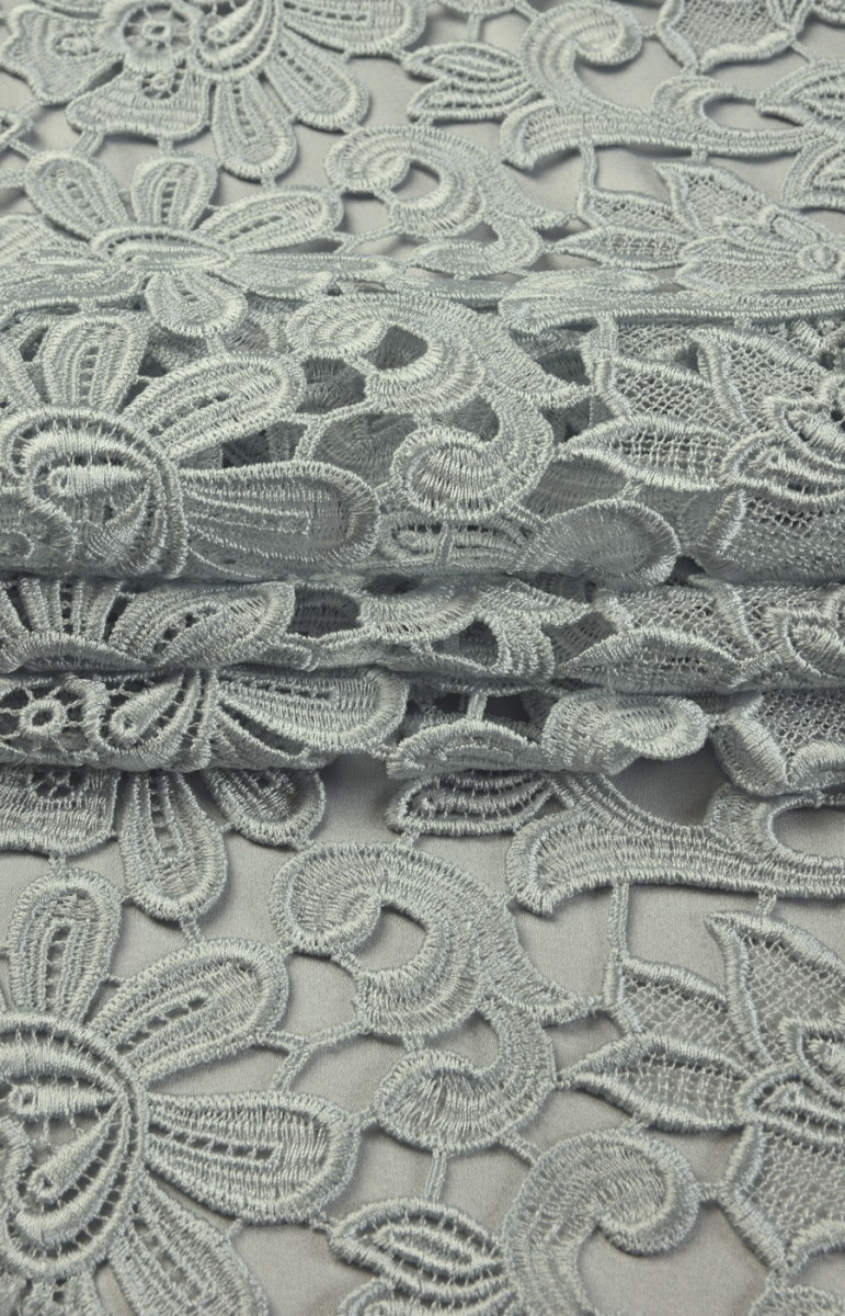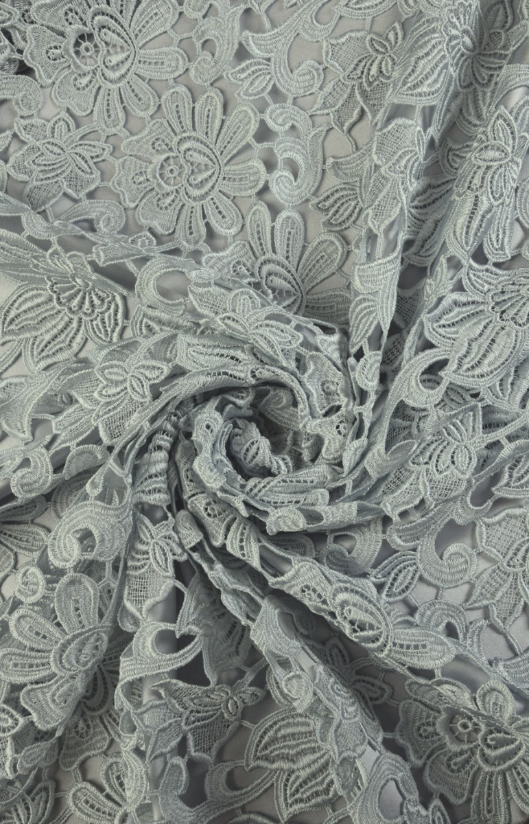 Гіпюрове мереживо сріблясто-сірого кольору, виткане з віскозних і поліамідних ниток. Для красивого ефекту рекомендуємо вибрати підкладку, наприклад, з шовкового атласу.
