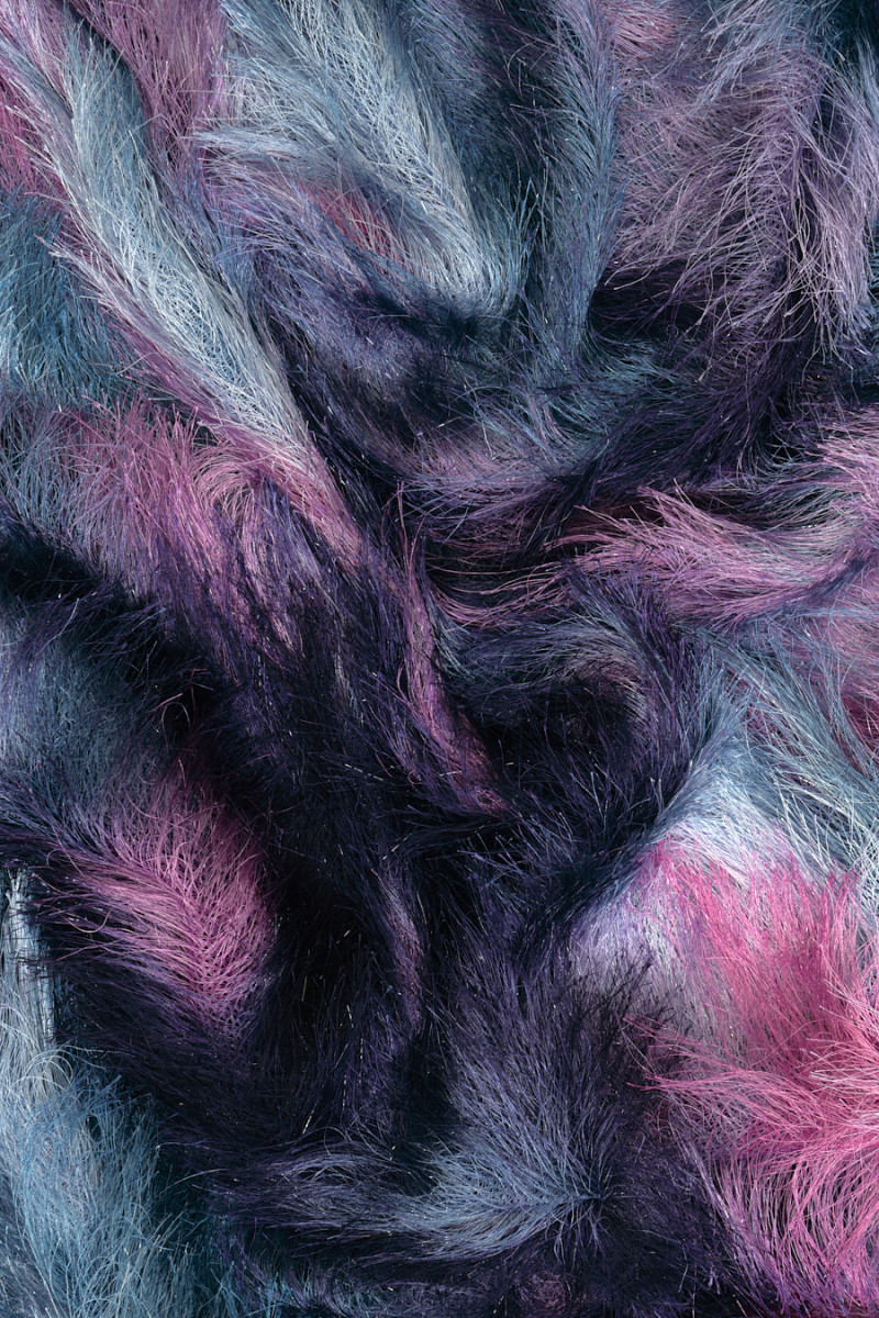 Італійська вечірня тканина у вигляді сітки з щільно пришитими китицями синього, темно-синього, фіолетового і рожевого кольорів і блискучими стрічками. Красиві кольори китиць створюють ефект затінення, дозволяючи створити унікальне творіння. Тканина злегка прозора, еластична, м'яка і легка.