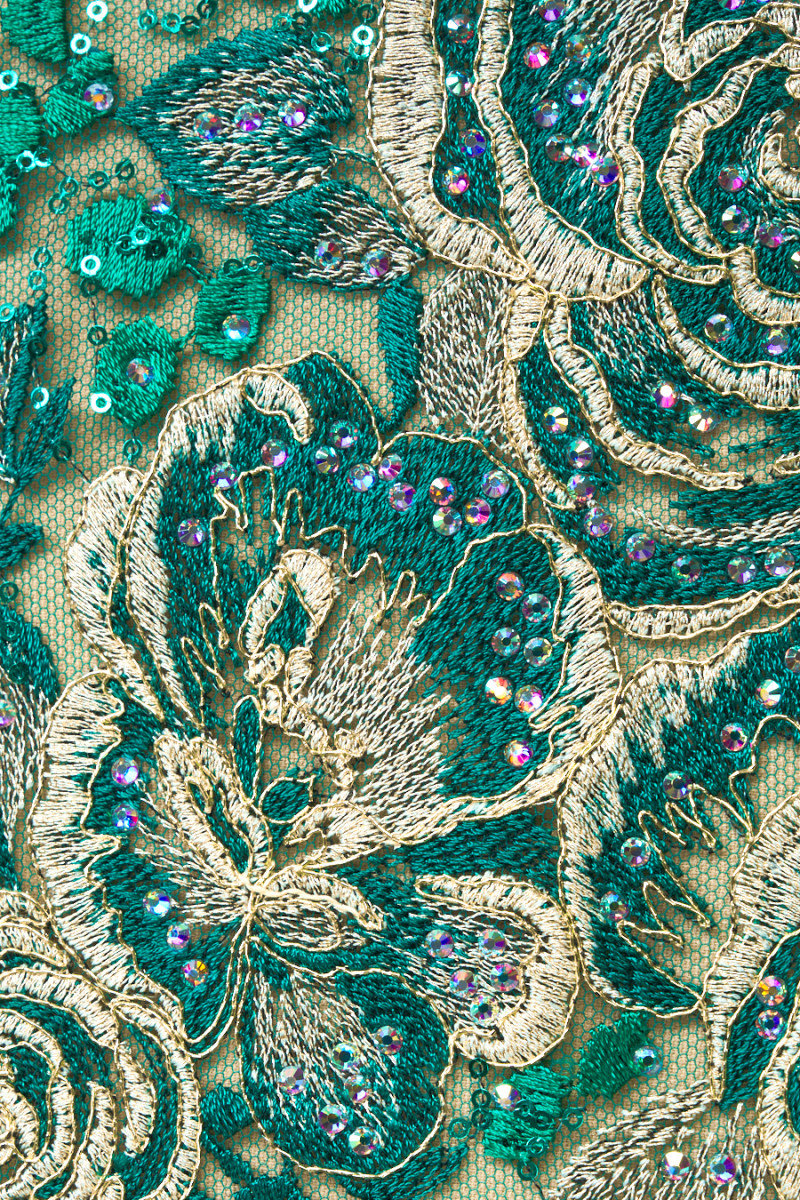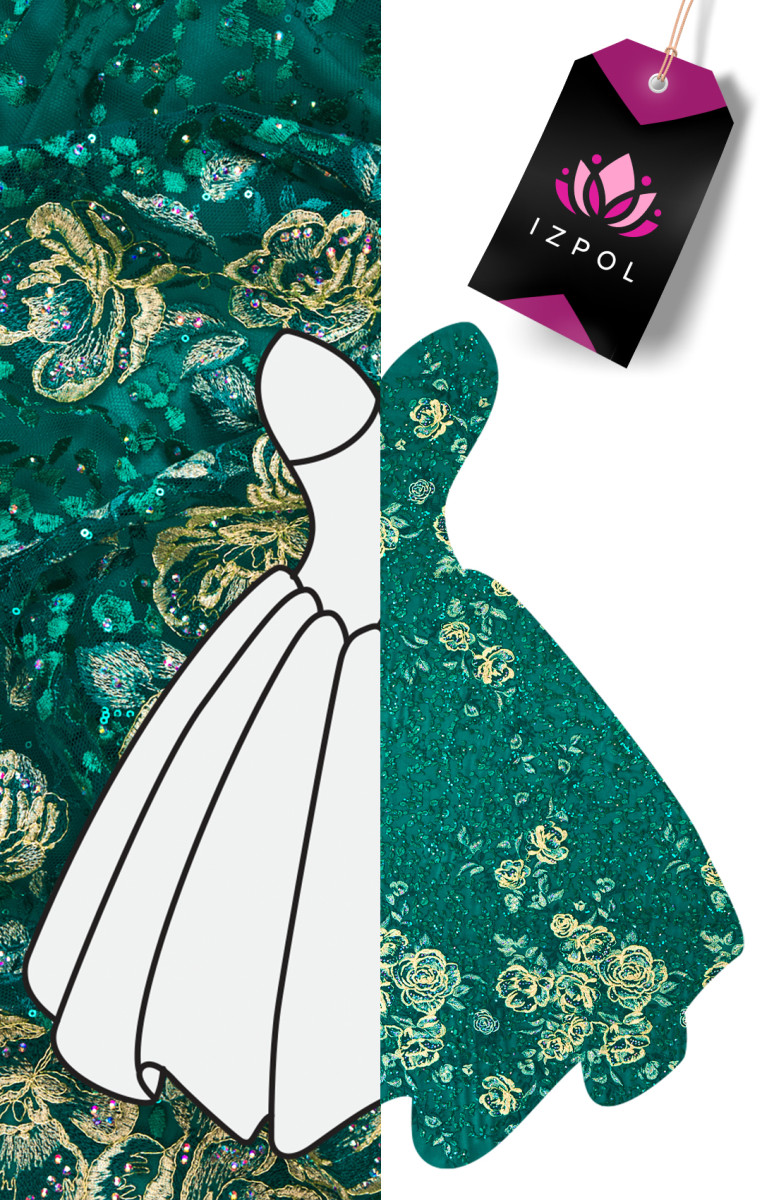 Італійський жорсткий тюль з класичними зеленими люверсами з вишитими золотими трояндочками і маленькими зеленими листочками, багато прикрашений переливаються камінням і дрібними зеленими паєтками. Вишивка потовщується до двох країв, тому рекомендуємо прошивати по периметру. Тканина дуже ефектна, прозора (вимагає підкладки), нееластична і легка. Камені, розміщені на тканині, красиво блищать, створюючи ексклюзивний вигляд тканини Фантастична пропозиція для пошиття вечірньої сукні, спідниці або блузки в дуже цікавому виданні.
