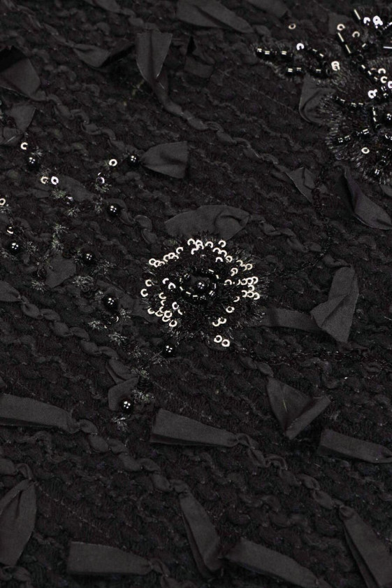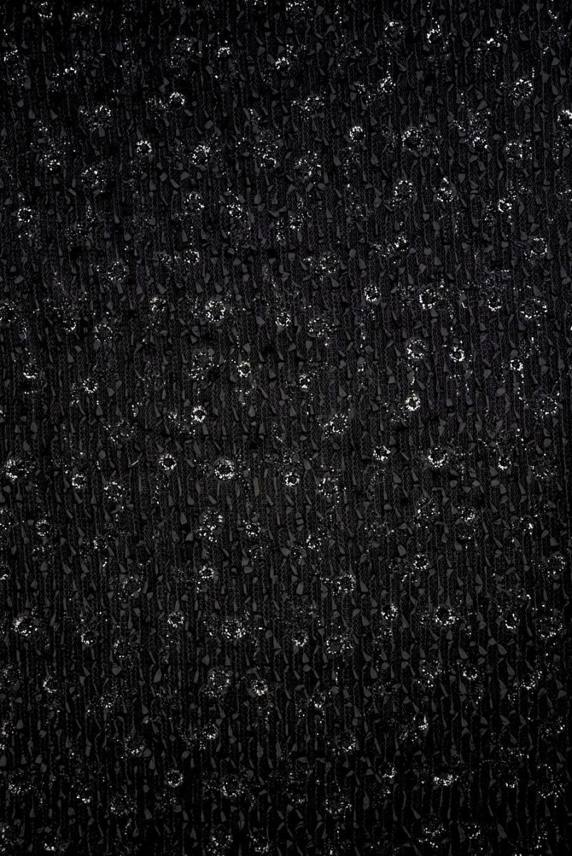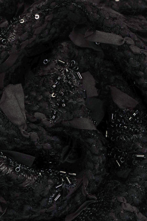 Італійська, ексклюзивна тканина, що нагадує в переплетенні чорні букле. Тканина має густо сплетені чорні стрічки, які виступають на 2,5 см і вишивані чорні квіти, густо прикрашені чорними паєтками і бісером. Тканина не еластична, нещільно плетена, м'яко драпірується, з чіткою структурою. Цікава пропозиція, з якої можна створювати сукні, спідниці, а також елегантний верхній одяг, такий як накидки, кардигани.