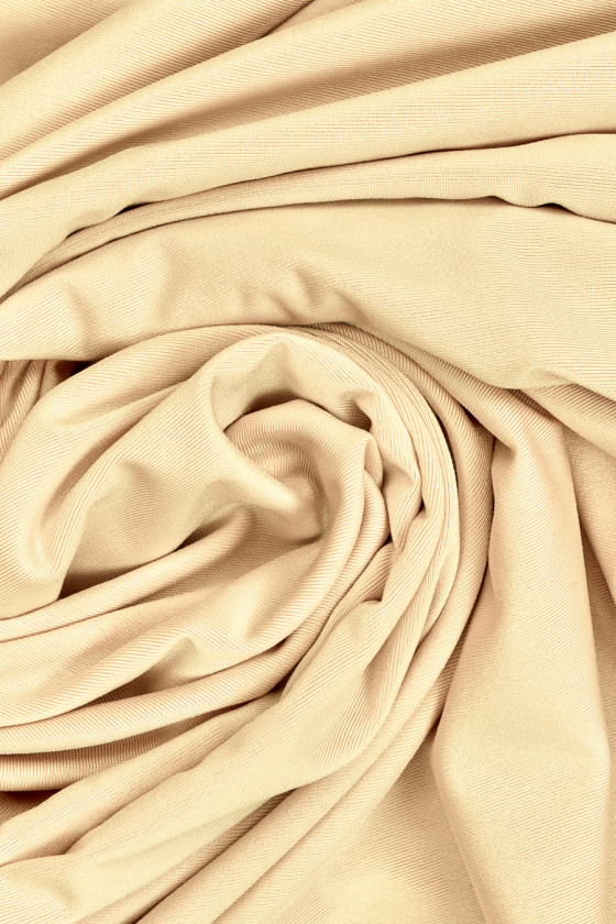 Італійське еластичне трикотажне полотно світло-бежевого кольору. Матеріал з щільним плетінням і гладкою структурою, тонкий, але непрозорий, дуже еластичний - ідеально підходить для людей, яким подобається облягаючий одяг і позачасові кольори. Вона відмінно підійде для пошиття блузки, сукні, а також для пошиття нижньої білизни, так як зручна і швидковисихає.