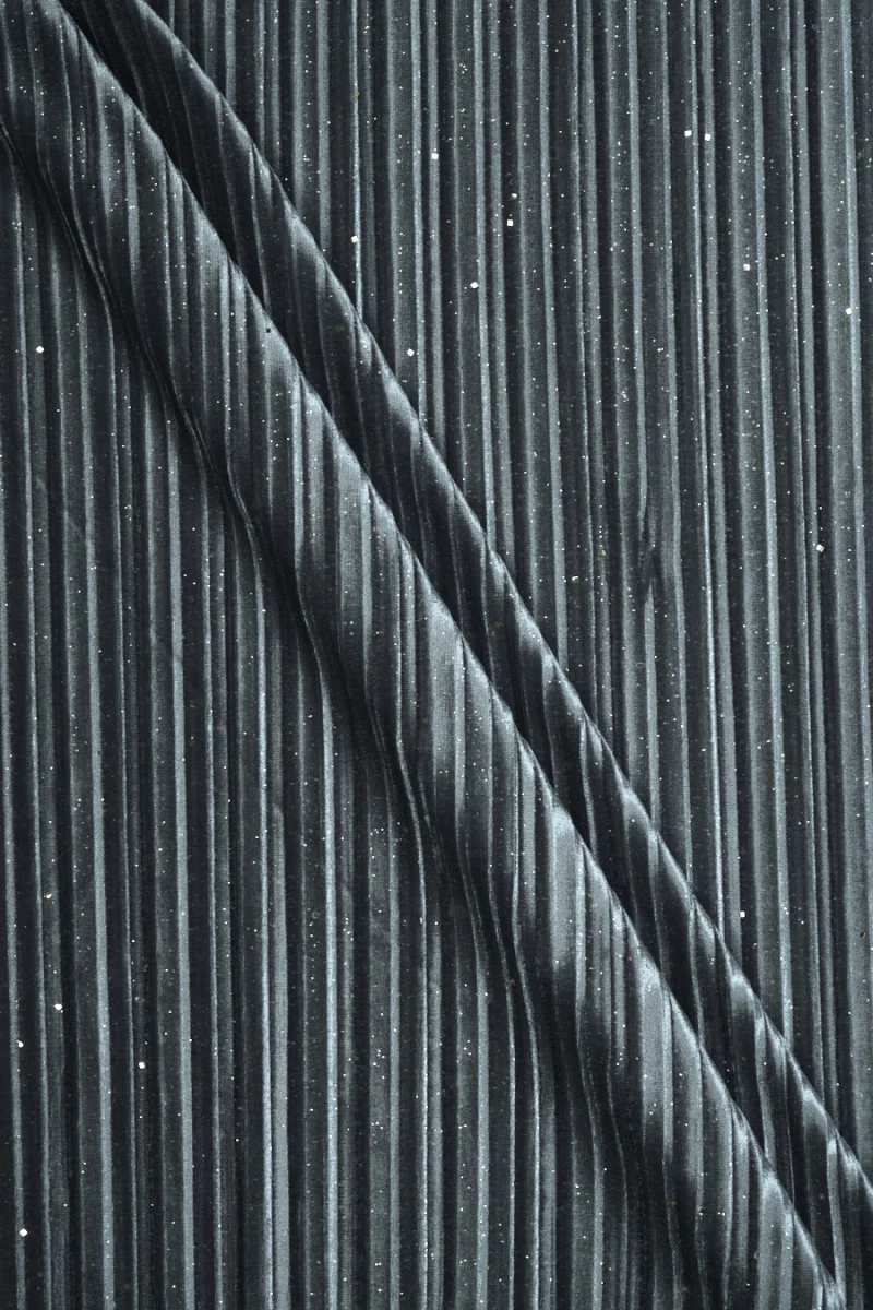 Італійський еластичний велюр, плісирований в трьох кольорах - сірому, чорному і рожевому з краплею фіолетового. Все красиво прикрашено дрібними, золотистими блискітками і крихітними, золотистими, неправильно розташованими квадратиками. Тканина м'яка, струмлива, дуже еластична по ширині тканини і непрозора. Він ідеально підходить для пошиття вечірніх і вечірніх нарядів, таких як сукні, спідниці, штани або блузи.