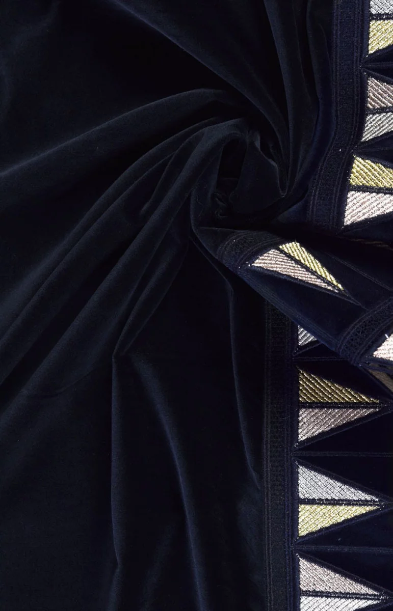 Красивий, злегка еластичний чорний оксамит з декоративним поясом, розшитим золотими трикутниками. Тканина випускається для відомого модельєра.