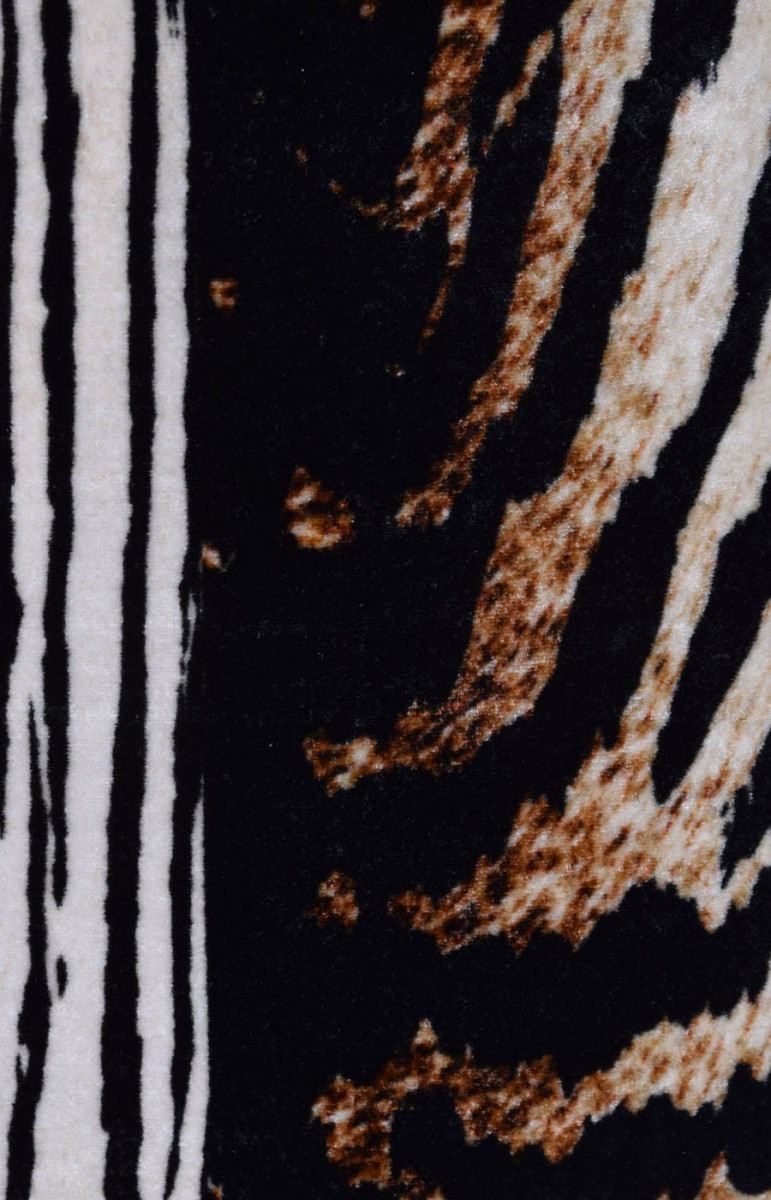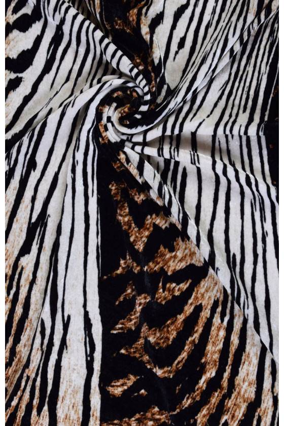 Красивий велюр з тваринним мотивом. Тканина виткана з віскози і нейлону. Дуже приємна на дотик, м'яка, струмлива. Він не прозорий. Випускається в купоні 135х140 см. Ідеально підходить для суконь.