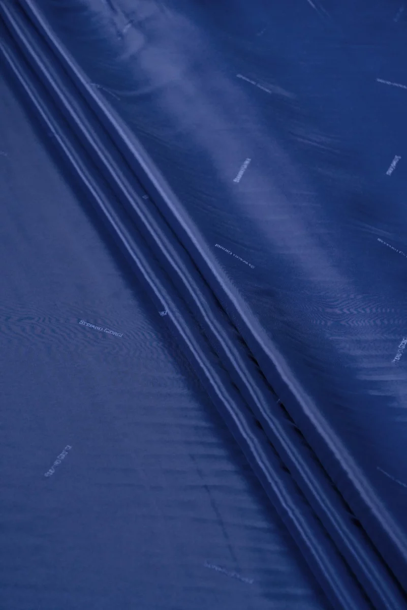 Італійська підкладка з віскози синього кольору. Підписаний ім'ям відомого модельєра. Тканина нееластична, злегка блискуча. Ідеально підходить для підкладки пальто, курток, жилетів, курток.