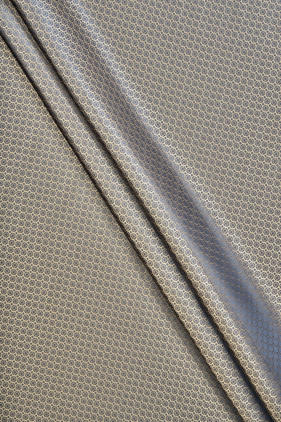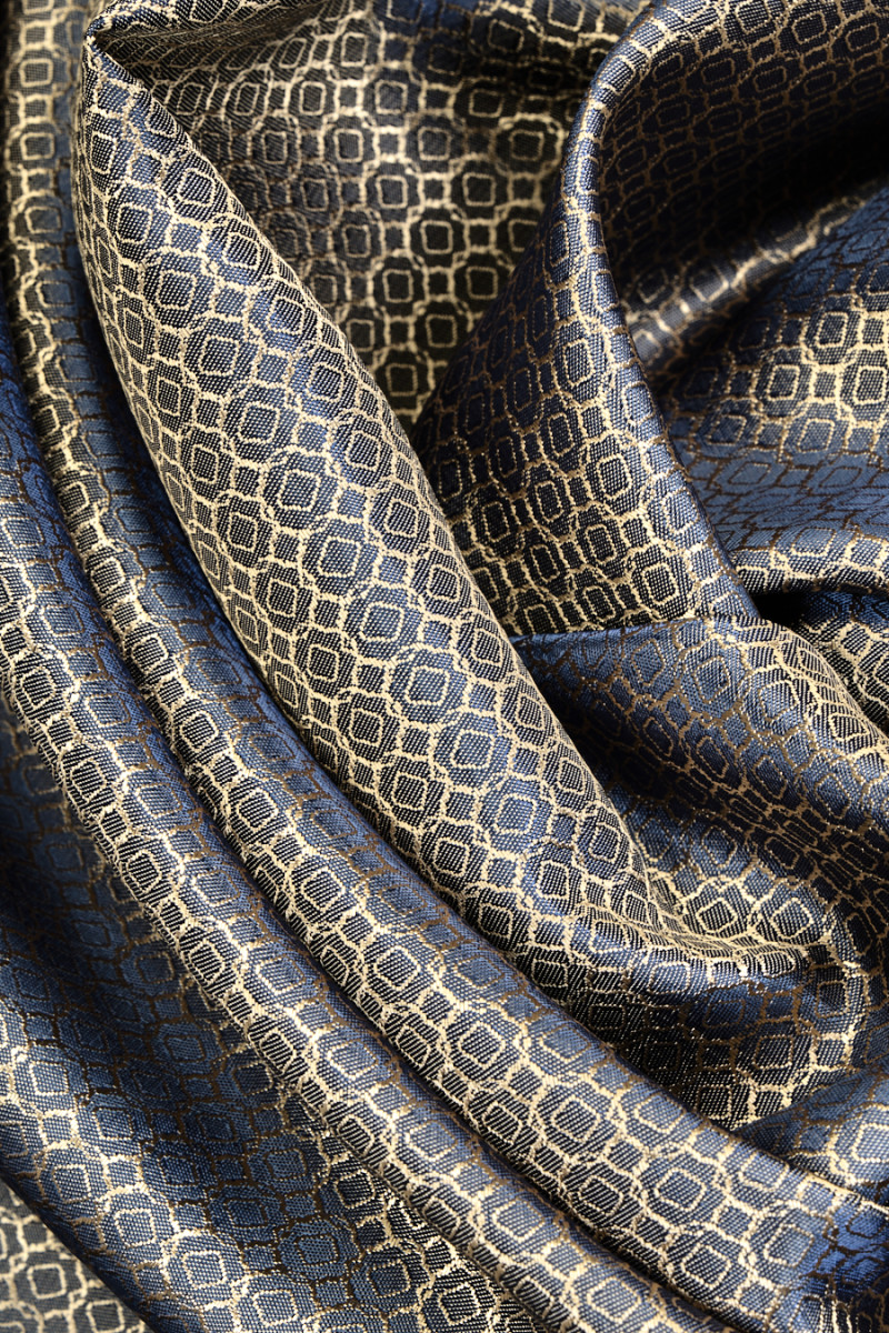 Італійська жакардова підкладка з двох кольорів ниток, золотого і темно-синього, які створюють двоколірний ефект. Тканина з щільним мотивом дрібних геометричних візерунків, що нагадують ромби шириною 0,5 см. Підкладка нееластична з дуже благородним блиском, її можна пришивати з двох сторін. Його натуральний склад робить його ідеальним в якості підкладки для куртки або пальто. Фантастична пропозиція для людей, які люблять цікаві, оригінальні підкладки.