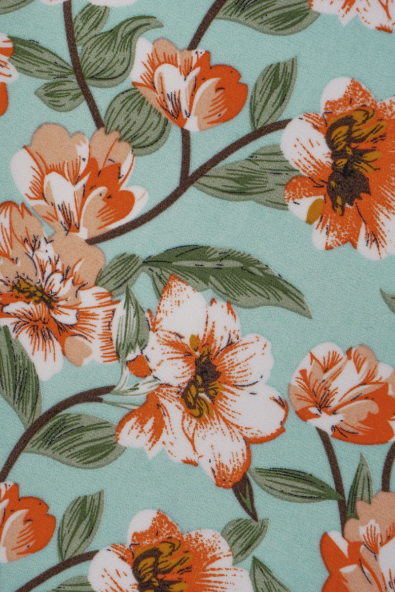Італійський поліестер жоржет - м'ята з помаранчевими квітками. Тонка (прозора), струмлива, що не еластична тканина - відмінно підійде для пошиття сукні, спідниці, повітряної блузки. Тканина вимагає підкладки.