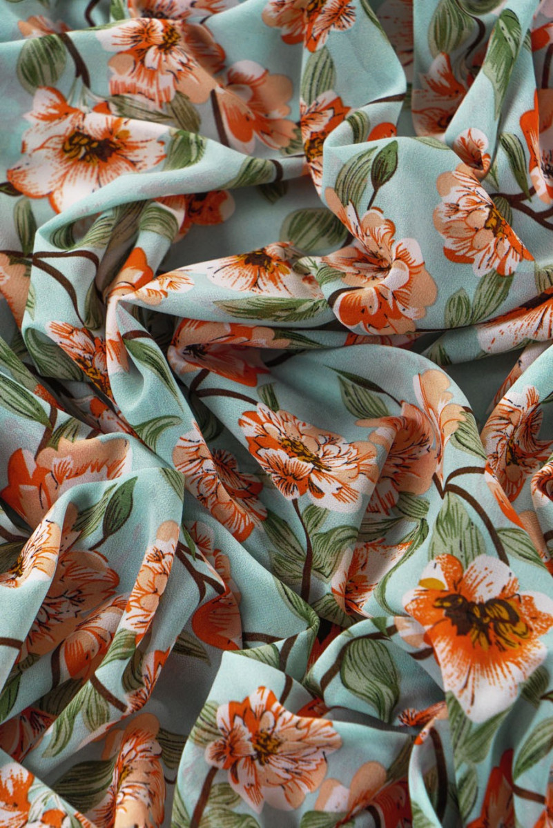 Італійський, тонкий поліестер жоржет - м'ятний з помаранчевими квітками.