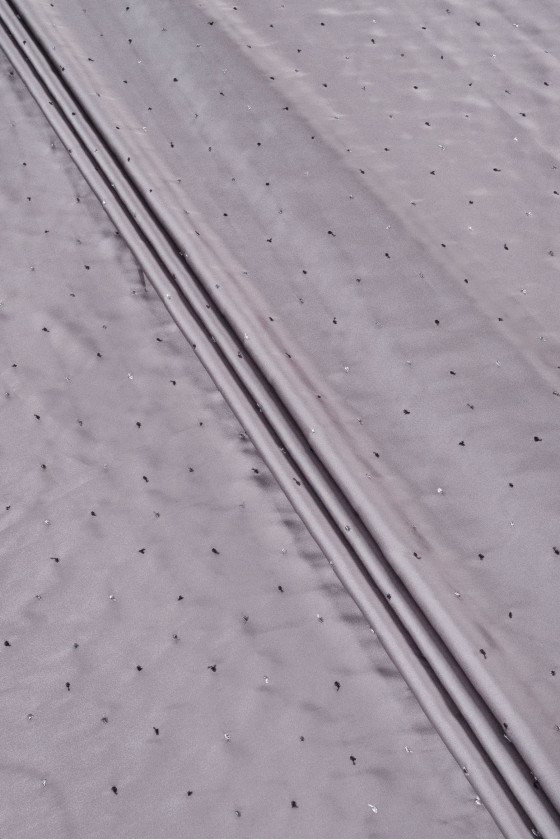 Італійський поліестеровий атлас фіолетового та сірого кольорів з вишитими дрібними крапками. Сатин - щільна і легка тканина з рівною поверхнею, виконана в атласному переплетенні. Додатковою перевагою є його плавність і довговічність, а також те, що він дуже добре лягає, не просвічується і приємний на дотик. З одного боку, він матовий, а з іншого - благородно блискучий. З його допомогою можна чаклувати над повітряними сукнями, ніжними блузами, спідницями, шарфами, хустками.