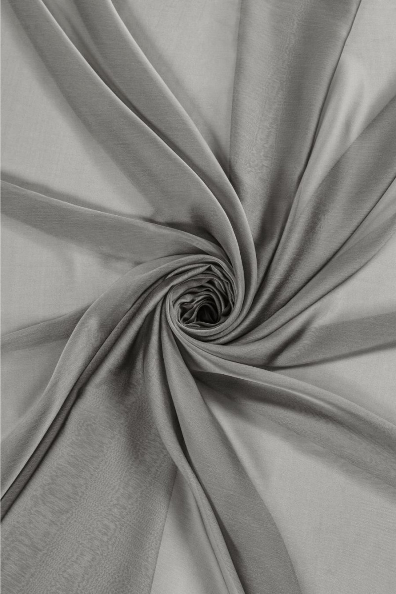 Італійська шифонова поліефірна тканина з цікавим переплетенням двох кольорів ниток - графітового і білого, які створюють двоколірний ефект. Тканина дуже ніжна, повітряна, прозора і не еластична. Відмінно підійде для повітряних суконь, спідниць і блуз, також з нього можна зшити красивий шарф.