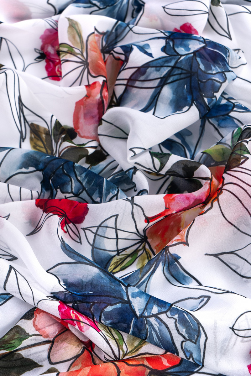 Італійський поліестеровий жоржет кремового кольору з мотивом різнокольорових квітів. Жоржет - тканина з пухким полотняним переплетенням з кручених ниток, що надає їй характерну, зернисту поверхню. Це повітряний і ніжний матеріал, прозорий, він укладається красиво, струмливим чином.