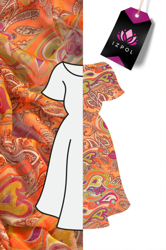 Італійський шифон поліестеровий (зім'ятий) зі східним мотивом в червоному і помаранчевому кольорах. Зім'ятий шифон - дуже ніжна, повітряна, прозора тканина зі злегка «зім'ятою» структурою. Відмінно підійде для пошиття повітряної сукні, спідниці, блузки або шалі.