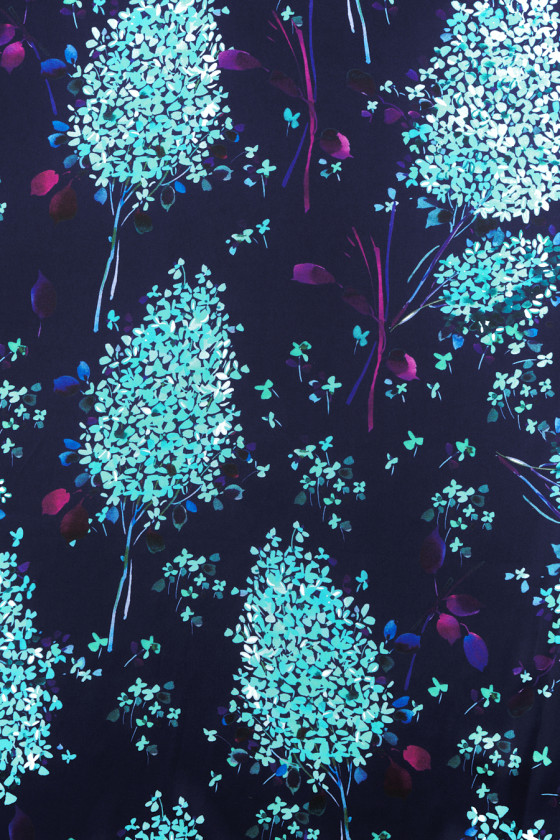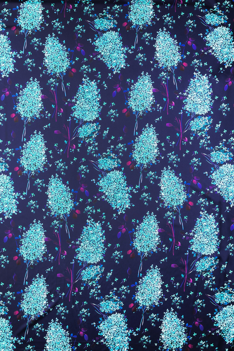 Італійський сатин з поліестеру преміум-класу темно-синього кольору з мотивом бірюзово-бузкових квітів. Сатин - щільна і легка тканина з рівною поверхнею, виконана в атласному переплетенні. Додатковою перевагою є його плавність і довговічність, а також те, що він дуже добре лягає, не просвічується і приємний на дотик. З одного боку, він матовий, а з іншого - благородно блискучий. З його допомогою можна чаклувати над повітряними сукнями, ніжними блузами, спідницями, шарфами, хустками.