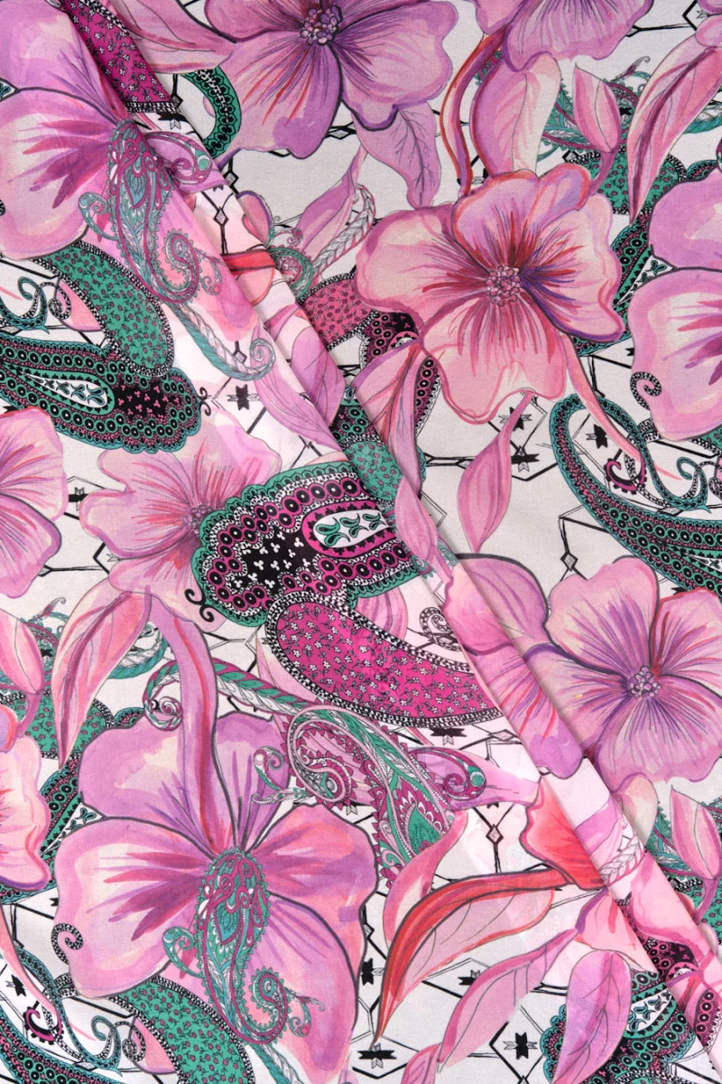 Італійський шифон з поліестеру кремового кольору з щільним мотивом великих, фіолетово-рожевих квіток. Все це оточене східними мотивами Пейслі в зеленому, рожевому і чорному кольорі і маленькими чорними стрілками. Тканина тонка і струмлива, тому відмінно підійде для пошиття літнього плаття або блузки. Фантастична пропозиція для шанувальників східних мотивів у весняних кольорах.