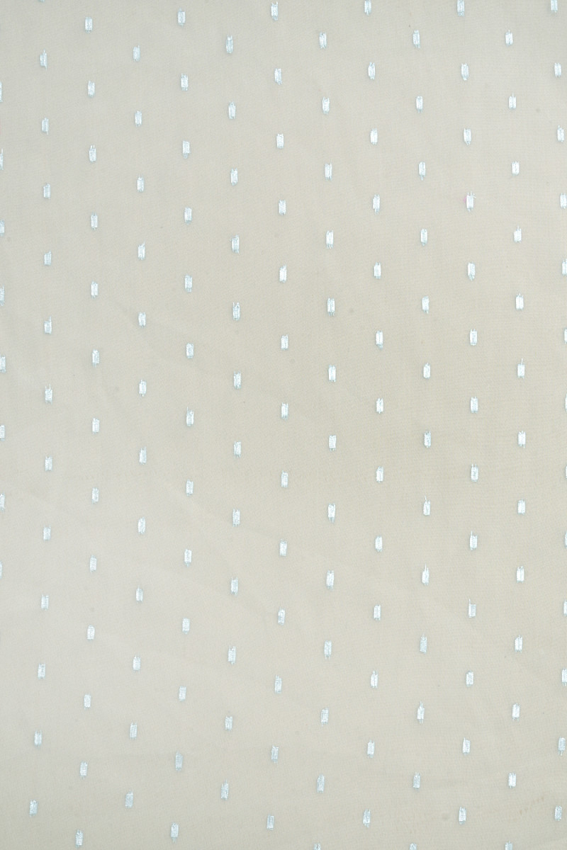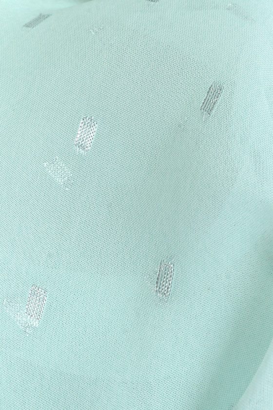 Італійський шифон з поліестеру м'ятного кольору з мотивом дрібних, геометричних візерунків зі срібної люрексової нитки. Тканина тонка і струмує, тому відмінно підійде для пошиття повітряного сукні, блузки або шалі. Фантастична пропозиція для шанувальників пастельних, злегка блискучих тканин.