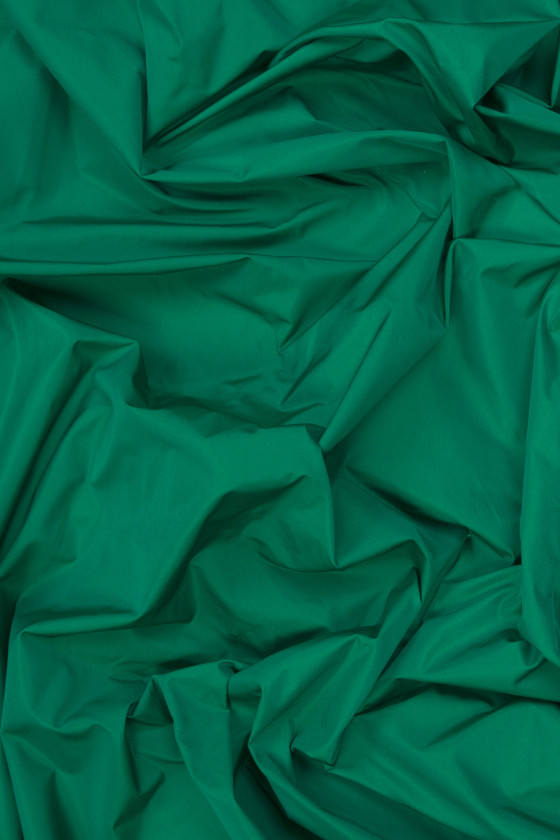 Італійська тканина тафта з поліестеру темно-зеленого кольору. Тканина тонка, але жорстка, злегка блискуча.