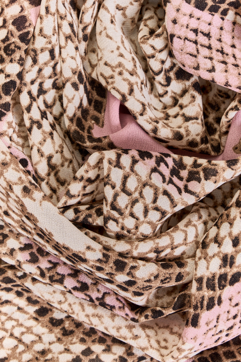 Італійська жоржета з поліестеру з великим мотивом зміїної шкіри бежевого, коричневого та чорного кольорів на рожевому тлі. Тканина з зернистою поверхнею, повітряна, злегка прозора, драпірується красиво, струмливим способом, нееластична. Ідеальна пропозиція для шанувальників візерунків тварин у позачасових кольорах. Він відмінно підійде для пошиття повітряного плаття, спідниці, блузи і сорочки.