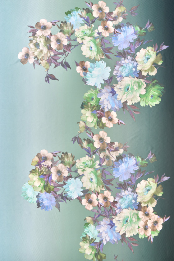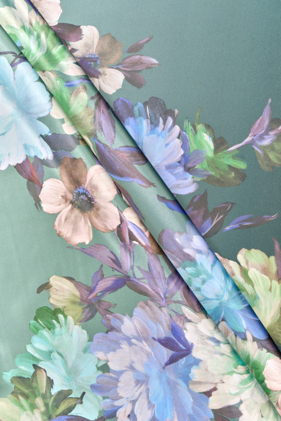 Італійський сатин з поліестеру з додаванням еластану з мотивом великих, пофарбованих квітів на затіненому, м'ятному тлі. Тканина поставляється в купонах 100см*140см. Густо укладений квітковий візерунок висотою 80 см. Тканина еластична, струмлива, ніжна на дотик, м'яка і красиво сидить. Фантастична пропозиція для людей, які шукають унікальні та цікаві матеріали для сорочок, спідниць, суконь або шарфів.