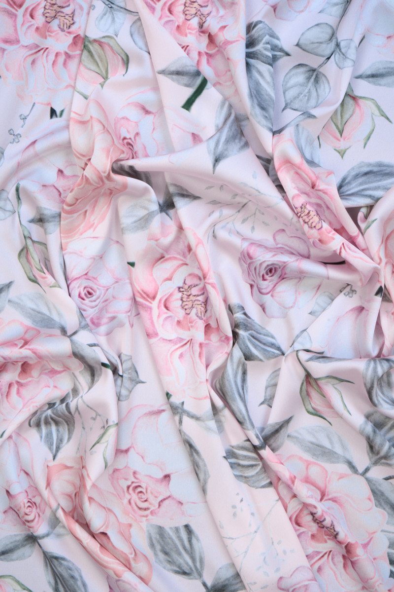 Італійський атлас з поліестеру з мотивом великих півоній на світло-рожевому тлі. Візерунок виконаний в ніжних, пастельних тонах. Тканина повітряна, легка, з гладким атласним переплетенням, ніжна і приємна на дотик. Романтична пропозиція для людей, які люблять квіткові візерунки. Тканина відмінно підійде для пошиття повітряного сукні, спідниці, блузки і сорочки.