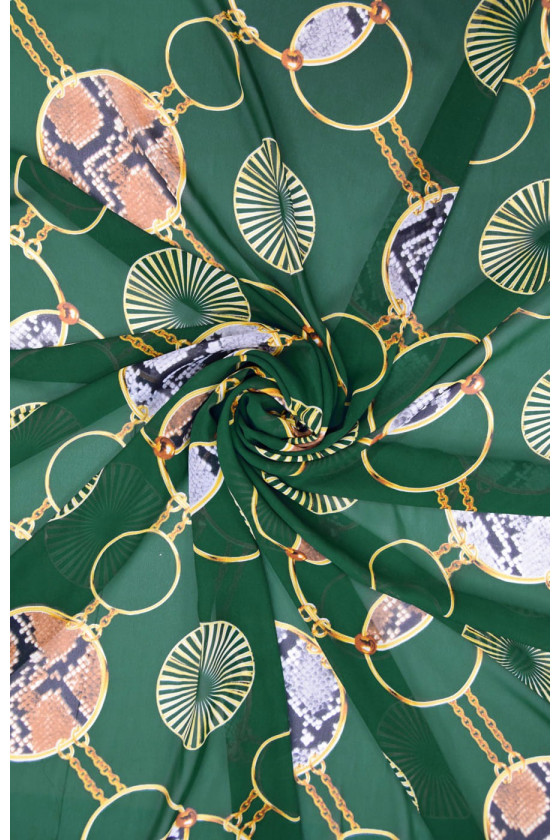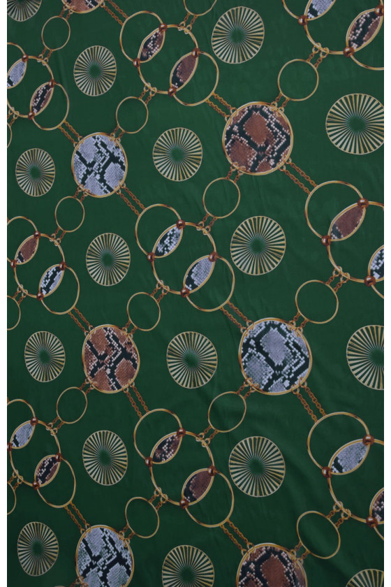 Поліестеровий шифон з химерним ювелірним малюнком (кружечки діаметром 12-15 см) - дуже ніжна, повітряна, прозора тканина. Ідеально підходить для повітряних суконь, спідниць, блуз або парео. Нееластична тканина. Кольори: на пляшково-зеленому тлі