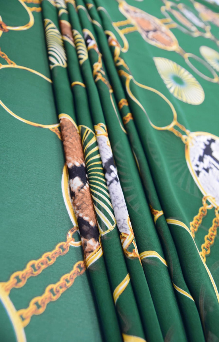 Поліестеровий шифон з химерним ювелірним малюнком (кружечки діаметром 12-15 см) - дуже ніжна, повітряна, прозора тканина. Ідеально підходить для повітряних суконь, спідниць, блуз або парео. Нееластична тканина. Кольори: коричневий, чорно-жовтий малюнок на пляшково-зеленому тлі.