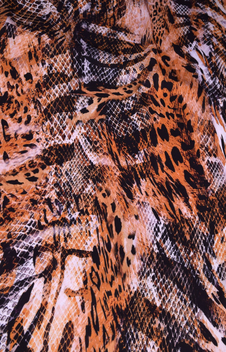 Атлас з поліестеру з тваринним малюнком. Рекомендуємо шити з нього сукні, блузи та спідниці. Тканина важка, струмлива, добре сидить. Вона не прозора, можна пришити її без підкладки. Граммаж підходить і для пошиття жіночих сорочок. Кольори: помаранчевий, чорний, екрю.
