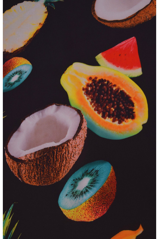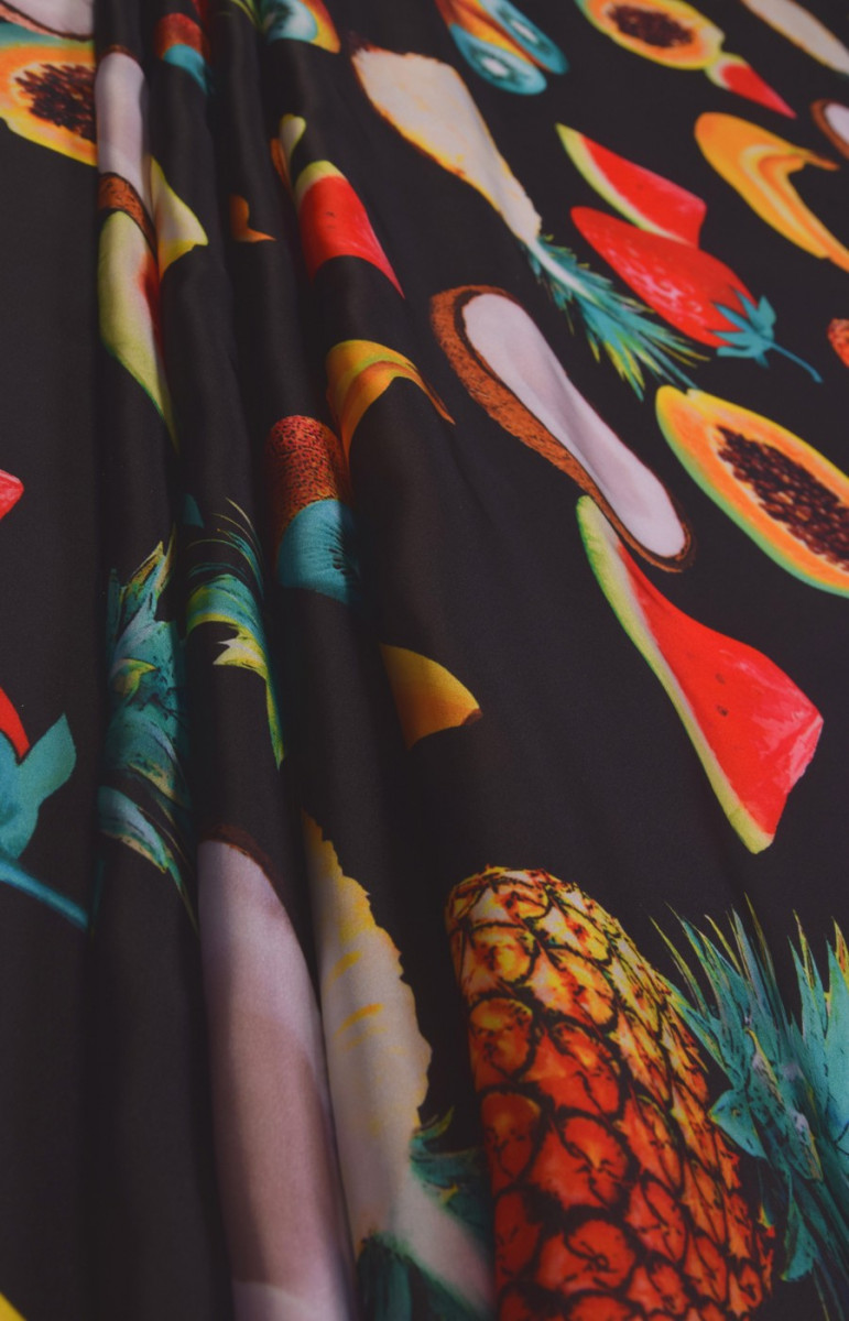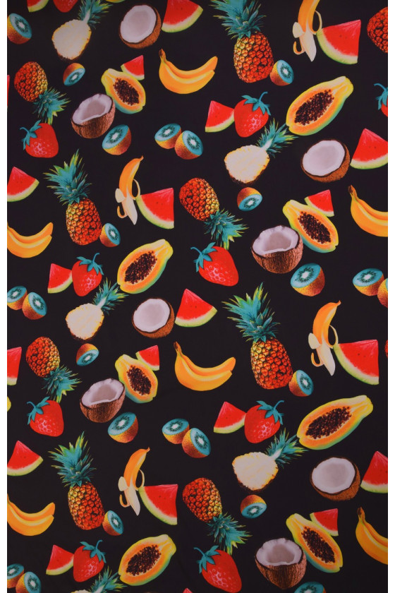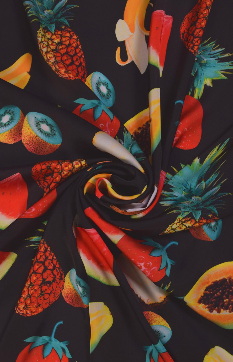 Поліестер сатин з фруктами, більш тонкий, повітряний, приємний на дотик, матовий. Рекомендуємо шити з нього літні сукні, блузи та спідниці. Вона злегка прозора, тому рекомендуємо використовувати підкладку. Дуже якісна тканина. Граммаж підходить і для пошиття жіночих сорочок. Забарвлення: різнокольорові плоди на чорному тлі. Малюнок плодів розміром близько 5-12 см.