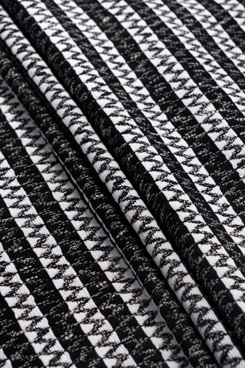 Тканина Шанель від відомого модельєра, виткана цікавим чорно-білим зигзагоподібним візерунком. Ми рекомендуємо його для пошиття тонких пальто, курток, костюмів.