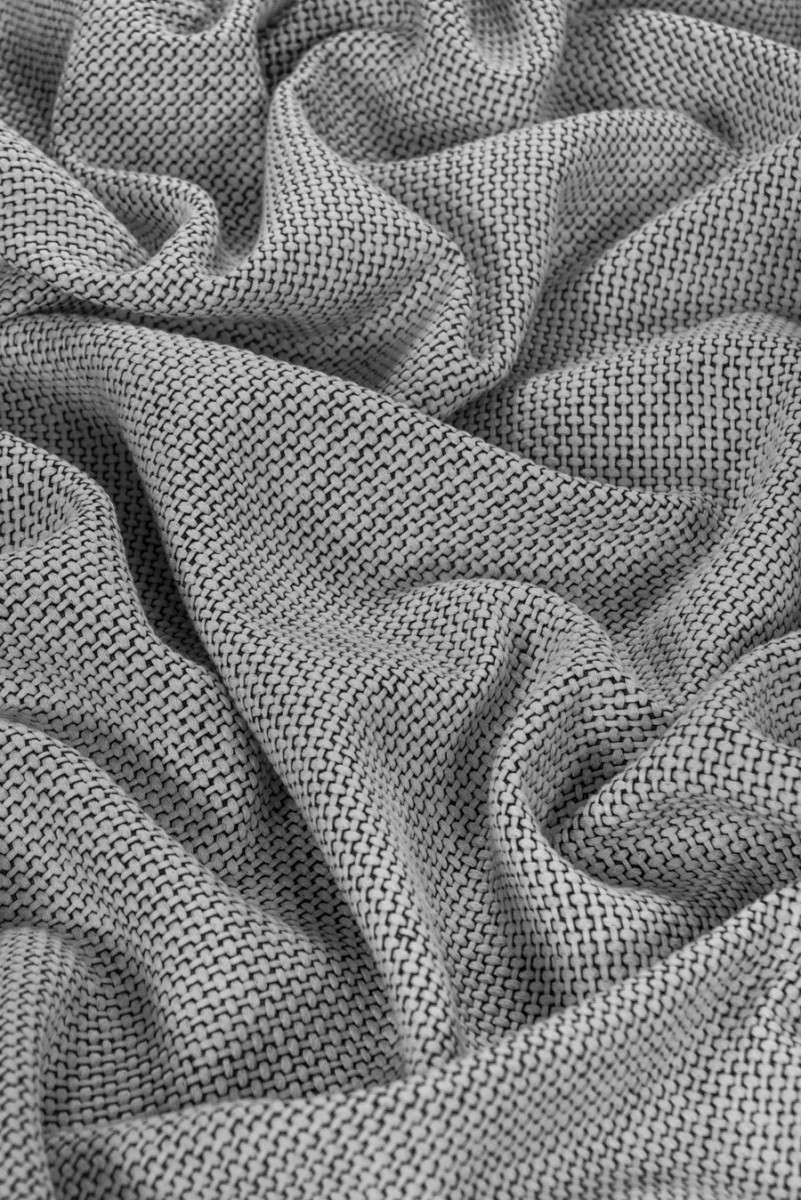 Костюмна тканина вільного плетіння, виткана з віскозних ниток – білого кольору, більш товстого і тонкого – чорного кольору. Натуральна, дихаюча, дуже оригінальна тканина. Рекомендуємо для пошиття цікавих суконь, кардиганів, пуансонів.