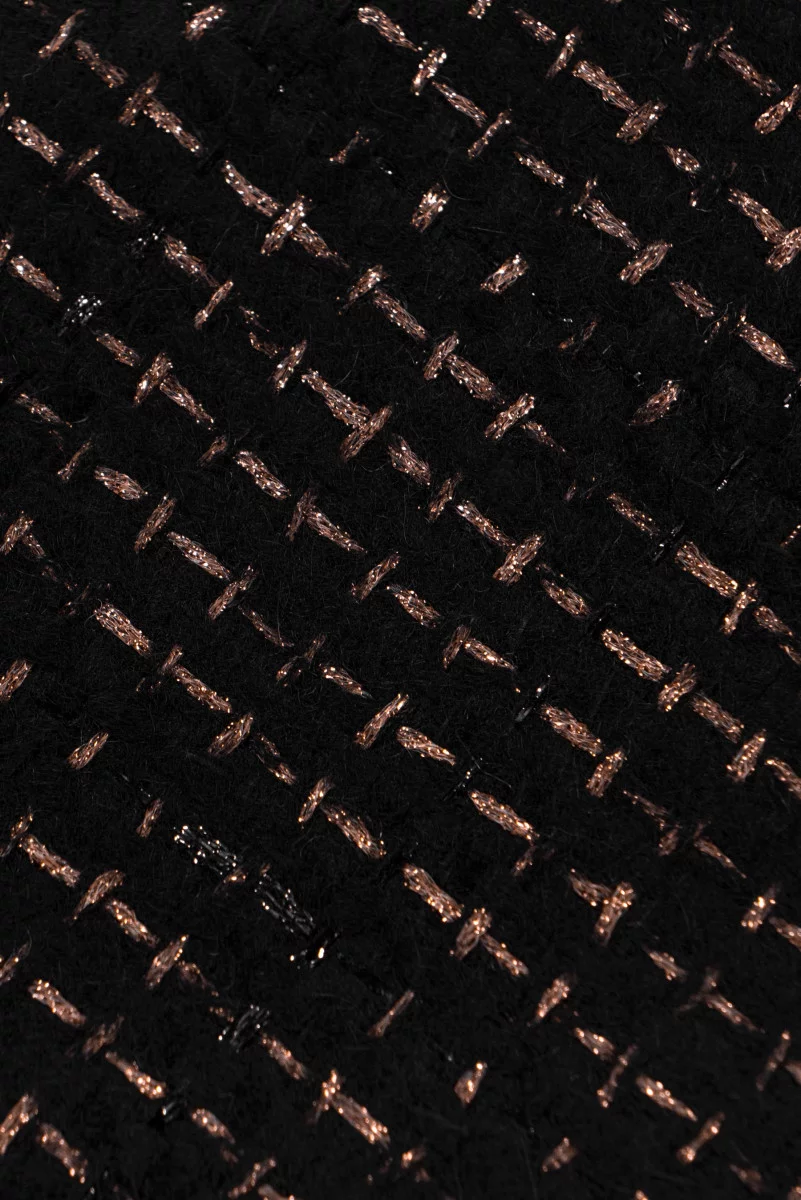 Італійська костюмна тканина Шанель чорного кольору з картатим мотивом, прикрашена мідною люрексовою ниткою. Більш щільна тканина з щільним переплетенням.